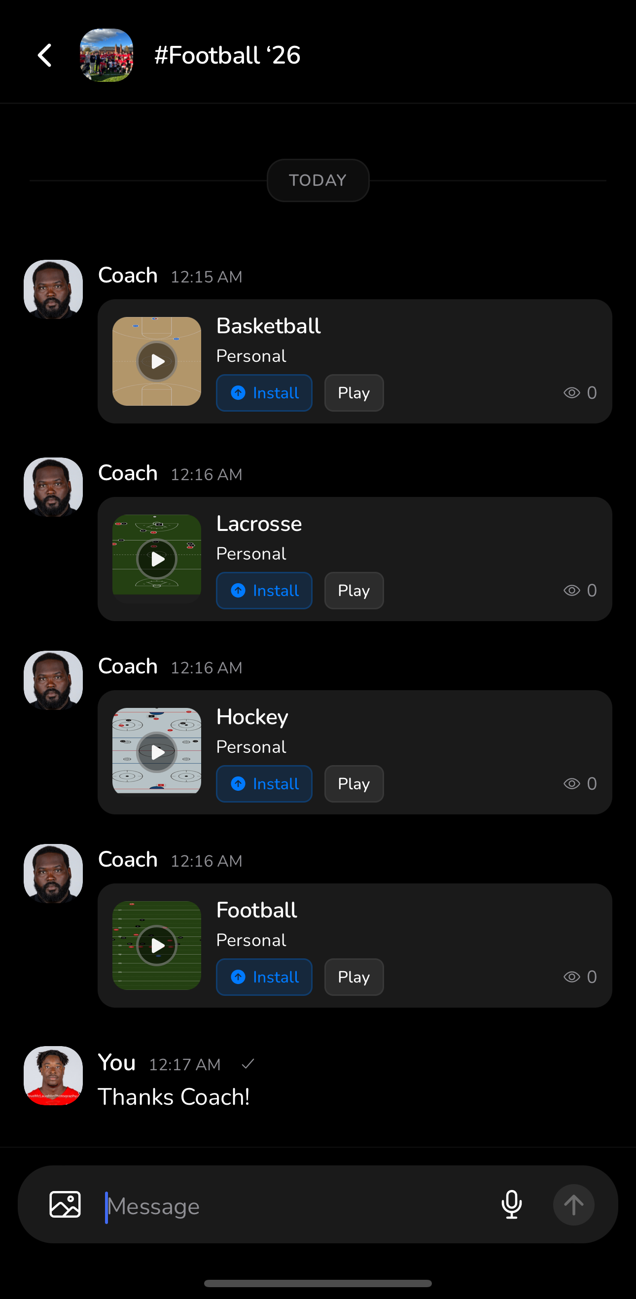 Channels, direct messages, and coach announcements in one place. No scattered group texts. Plays share directly into the conversation.